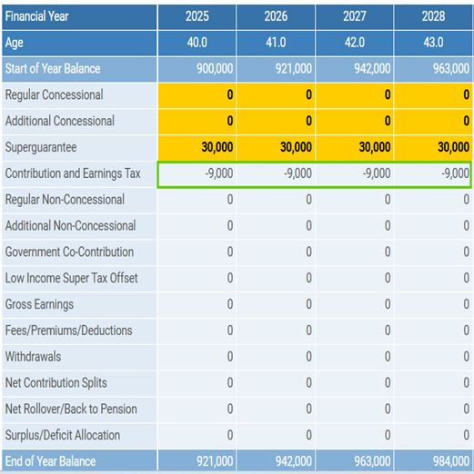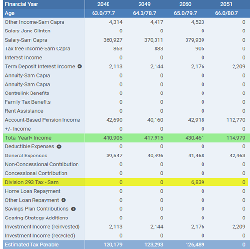 In most cases, this tax is paid directly from the client’s super balance. However, the Division 293 tax row will only appear in the cashflow if there is a year when the super balance is $0 at the end of the year (typically when a full rollover occurs during that year). In this situation, the client has triggered Division 293 tax but cannot pay it from their Super, so it is treated as a personal expense in cashflow.