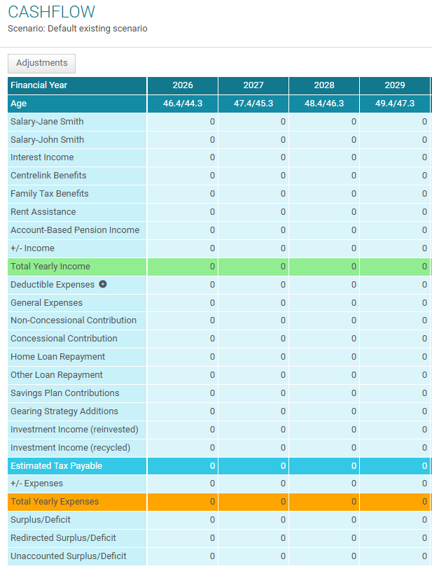 You can make manual adjustments to income or expenses in any given year using the adjustments button.