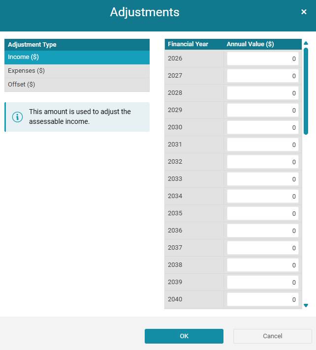 You can also manually amend taxable income, deductible expenses and any relevant offsets for any given year using the adjustments button.