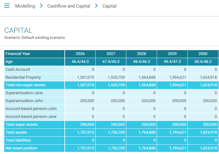 The Capital menu shows you a detailed projected value of your clients different assets over time, both at an individual asset level as well as an overall asset position.