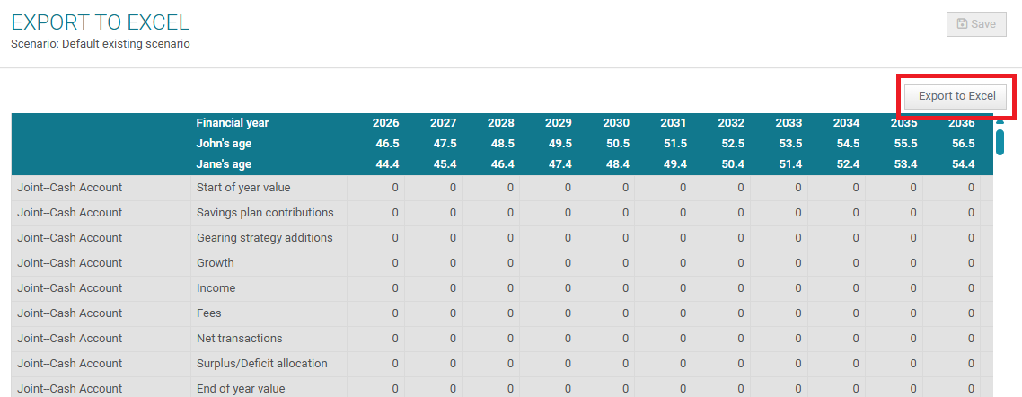 The export to excel function allows you to extract all of the data that has been input into C&C, including your clients assets, loans, super, pension and other relevant information. This can be done by clicking the button on the top right of the page.